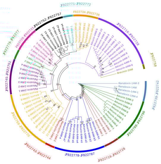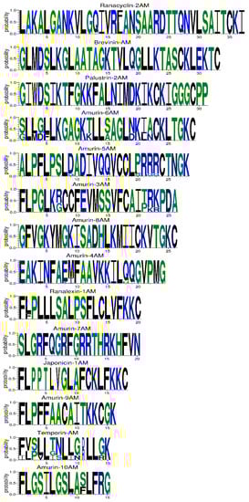Each AMP has an antimicrobial spectrum, and the spectra of different AMPs can overlap to form a broad, enhanced spectrum covering almost all microbial pathogens, given that the AMP system is highly diverse [,]. By this means, frogs may successfully protect themselves from complex environmental pathogen communities. In this study, we obtained 266 AMP cDNA sequences from the skin of R. amurensis, R. dybowskii, and P. nigromaculatus. The three species varied greatly in AMP composition, with 14 families in R. amurensis, 7 families in R. dybowskii and 13 families in P. nigromaculatus (see Table A1, Table A2 and Table A3). AMPs of each family had similar structure and physicochemical properties, while the structure and physicochemical properties varied greatly from family to family (Table A1, Table A2 and Table A3, Figure 7, Figure 8 and Figure 9). This demonstrates that the three species sympatric to northeast China use different sets of highly diverse AMPs to cope with similar microbial environments.