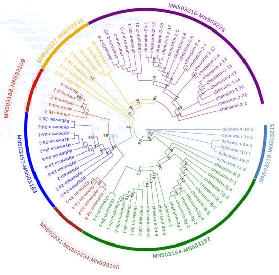 The 79 AMP cDNA sequences from R. dybowskii encoded 24 mature peptides of 7 families (Figure 10). All families were rich in Leucine (L), taking the total number of residues up to 40%. Except for family dybowsin-3 and chensirin-2, all families were also rich in Glycine (G). Family chensirin-3, dybowsin-1, dybowsin-2, and dybowsin-3 were enriched in hydrophobic amino acid residues, such as Valine (V), Alanine (A), Isoleucin (I), and Phenylalanine (F). The molecular weight ranged from 1406.8 to 3732.4. The pI ranged from 8.75 to 10.07, except for the family chensirin-1, whose pI was as low as 5.81 (Figure 7). All AMPs were hydrophobic with a compact pattern of pI values (Figure 8). Except for the family amurin-3 (53.31, 63.26) and chensirin-2 (43.01) that were predicted to be unstable, most of the AMPs showed high stability (Figure 9). The family chensirin-2 was in free curly structure, namely mixed, and all other AMPs were in all-α conformation (Table A2).