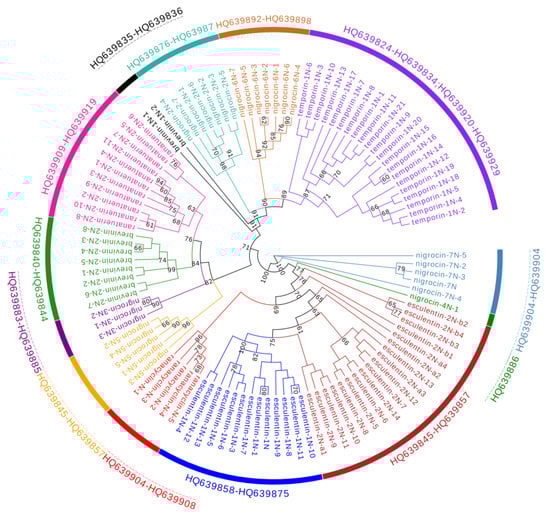 The 106 cDNA sequences of P. nigromaculatus were clustered to 13 clades (Figure 3). Seven clades corresponded to reported AMP families, namely brevinin-1N, brevinin-2N, esculentin-1, esculentin-2, ranacyclin-N, ranatuerin-2N, and temporin-1. The other six clades were novel AMPs, and were assigned family names, viz, nigrocin-2N, nigrocin-3N, nigrocin-4N, nigrocin-5N, nigrocin-6N, and nigrocin-7N.