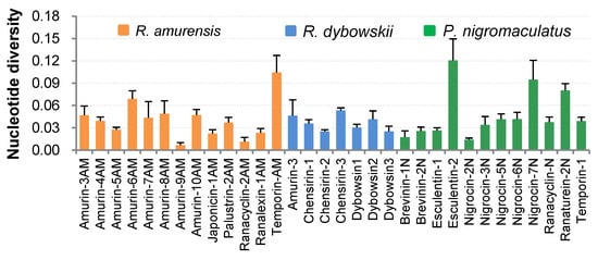 Except for nigrocin-4N in P. nigromaculatus and brevinin-2AM in R. amurensis, which had only one cDNA sequence each, nucleotide diversity (π) of the remaining 32 AMP families was analyzed (Figure 4). The average nucleotide diversity of all AMPs of R. amurensis ranged from 0.007 ± 0.003 to 0.104 ± 0.023, averaging 0.040 ± 0.010. The highest diversity was seen in the family temporin-AM (average 0.104 ± 0.0023), and the least in family amurin-9AM (0.007 ± 0.003). The nucleotide diversity of AMP families varied little even in R. dybowskii, for which π values ranged between 0.025 ± 0.002 and 0.053 ± 0.003, averaging 0.104 ± 0.023. For P. nigromaculatus, π values of 9 of 12 AMP families also varied little, ranging from 0.014 ± 0.002 to 0.042 ± 0.009 with a mean 0.031 ± 0.007. However, three families namely esculentin-2, nigrocin-7N, and ranaturein-2N had high variation and set the upper limit at 0.121 ± 0.029. The average π value of the three families was 0.099 ± 0.021.