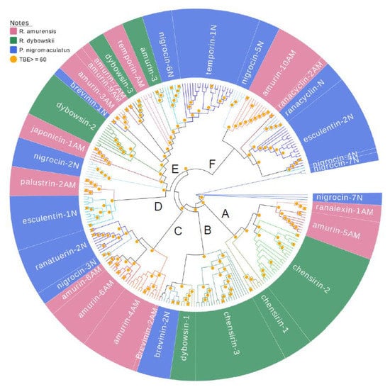 A phylogenetic tree of all antimicrobial peptide (AMP) genes identified from three anuran species, namely R. amurensis (pink), R. dybowskii (green) and P. nigromaculatus (blue). Orange dots in the figure are confidence values with transfer bootstrap expectation (TBE) 1000 replicates; only values ≥60 are shown.