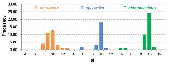 Frequency distribution of theoretical isoelectric points (pI) of antimicrobial peptides (AMPs) isolated from the three anuran species.