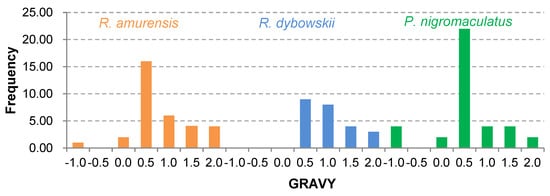 Frequency distribution of hydrophobicity predicted for all antimicrobial peptides (AMPs) isolated from the three anuran species.