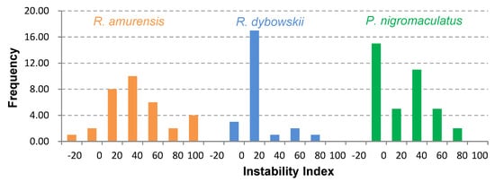 Frequency distribution of Instability index (II) values of all antimicrobial peptides (AMPs) isolated from the three anuran species.