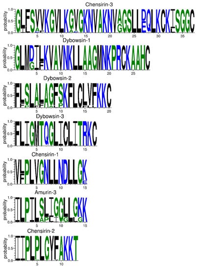 The primary structure of mature peptides of 7 antimicrobial peptide (AMP) families from R. dybowskii. The blue letters represent hydrophilic residues, including Arginine (R), Lysine (K), Aspartic acid (D), Glutamic acid (E), Asparagine (N), Glutamine (Q); the green letters represent neutral residues namely Serine (S), Glycine (G), Histidine (H), Threonine (T), Alanine (A), and Proline (P); the black letters represent hydrophobic residues, including Tyrosine (Y), Valine (V), Leucine (L), Isoleucine (I), Phenylalanine (F), Tryptophane (W), Methionine (M), and Cysteine (C). 63.6% sequences (14 out of 22) of chensirin-3 had deletion of a short fragment spanning site 19 to 22; 80.0% sequences (1 out of 5) of amurin-3 had an amino acid deletion at site 15.