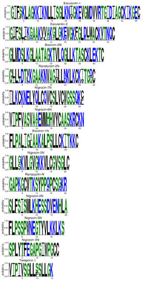 The primary structure of mature peptides of 14 AMP families from R. amurensis. The blue letters represent hydrophilic residues, including Arginine (R), Lysine (K), Aspartic acid (D), Glutamic acid (E), Asparagine (N), Glutamine (Q); the green letters represent neutral residues, namely Serine (S), Glycine (G), Histidine (H), Threonine (T), Alanine (A), and Proline (P); the black letters represent hydrophobic residues, including Tyrosine (Y), Valine (V), Leucine (L), Isoleucine (I), Phenylalanine (F), Tryptophane (W), Methionine (M), and Cysteine (C).