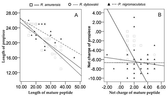 For all 266 cDNA sequences, the number of amino acid residues of the propiece was negatively correlated with that of the mature peptide of the same sequence (r = −0.762, p = 0.000). Similar significant correlation was recorded for cDNAs of each species (R. amurensis: r = −0.645, p = 0.000; R. dybowskii: r = −0.931, p = 0.000; and P. nigromaculatus: r = −0.858, p = 0.000) (Figure 12A).