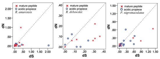 To further visualize the selection mode of the propiece and mature peptide region, the dN was plotted against dS values for each family of the three species (Figure 13). The distribution of dN and dS values of R. amurensis in both propiece and mature peptide regions was relatively compact below 0.50, except for temporin-AM (dN = 0.99, mature peptide region) and amurin-6N (dS = 2.05, propiece region). For the mature peptide region, families amurin-3AM, amurin-5AM, ranacyclin-2AM, and temporin-AM plotted above the neutral line ω = 1, while families amurin-4AM, amurin-6AM, amurin-7AM, amurin-8AM, amurin-9AM, amurin-10AM, japonicin-1AM, palustrin-2AM, and ranalexin-1AM plotted below the neutral line ω = 1. For the acidic propiece region, families amurin-3AM, amurin-4AM, amurin-5AM, amurin-8AM, amurin-9AM, amurin-10AM, and japonicin-1AM plotted above the line ω = 1, while families amurin-6AM, amurin-7AM, palustrin-2AM, ranacyclin-2AM, ranalexin-1AM and temporin-AM plotted below the neutral line. The pattern of dN and dS values suggests that the mature peptide and acidic propiece region were all differentially selected.