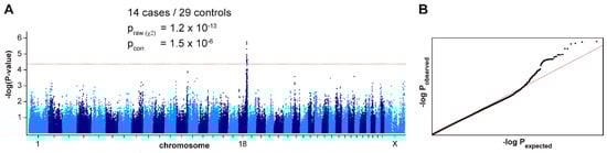 Mapping of the ECLE locus by genome-wide association. (A) Manhattan plot illustrating a single signal on chromosome 18. The dashed red line indicates the threshold for suggestive significance at p = 5 × 10−5 according to [29]. The best associated marker did not reach the stringent Bonferroni significance threshold (pBonf. = 4.3 × 10−7) due to several close relationships and extreme genomic inflation in the dataset. The genomic inflation factor was 1.90 before and 0.99 after the correction. (B) The quantile–quantile (QQ) plot shows the observed versus expected –log(p) values. The straight red line in the QQ plot indicates the distribution of p-values under the null hypothesis. The deviation of p-values at the right side indicates that these markers are stronger associated with the trait than would be expected by chance. This supports the biological significance of the association.