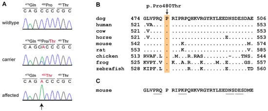 Details of the UNC93B1 missense variant. (A) Representative Sanger electropherograms from dogs with the three different genotypes at c.1438C>A are shown. The amino acid translation is indicated. (B) Evolutionary conservation of the SDCBP binding domain [30]. The proline at position 480 of the canine UNC93B1 protein is strictly conserved across all vertebrates. The sequences were derived from the following database accessions: dog XP_540813.3, human NP_112192.2, cow XP_540813.3, horse XP_023510352.1, mouse NP_062322.2, rat NP_001101983.1, chicken XP_004941322.1, frog NP_001093723.1, zebrafish XP_0026660582.1. (C) Scanning-alanine mutagenesis in mouse macrophages identified four mutants that disrupt SDCBP binding and lead to upregulated TLR7 signaling [30]. The altered residues in these mutants are underlined.