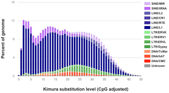 The analysis revealed that 41.51% of the assembled M. leonina genome consisted of repeat sequences, of which 33.28% were transposable elements (TE), including LINEs (22.12%), SINEs (6.06%), LTRs (3.06%), and DNA transposons (1.81%) (Table 3). The Kimura divergence (κ-values) estimates the age and transposition history of TEs [23]. The LINEs are the most abundant transposable elements. Kimura distances (κ-values) were calculated for all TE copies of each element in order to estimate the “relative age” and transposition history of TEs [24]. The calculated Kimura divergence for all the TE copies of M. leonina is shown (Figure 2) and strongly shaped by LINEs (κ-values ≤5), which means that transposable elements, and LINEs in particular, are a recent development in the southern elephant seal genome due to very similar copies (low κ-values) are indicative of rather recent activity.