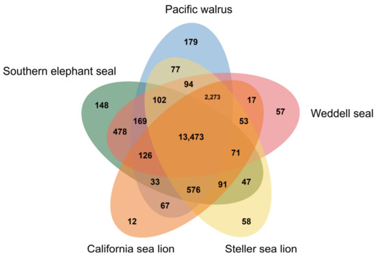 Synteny analyses of chromosomes between California sea lion (Zalophus californianus) reference genome and southern elephant seal were performed using SyMAP v3.4 [28]. Southern elephant seal assembly is highly contiguous compared to the 18 chromosomes of the California sea lion (Figure 3 and Supplementary Table S3). A total of 2.22 Gb of southern elephant seal assembled genome were mapped to California sea lion chromosomes. OrthoVenn2 [29] was used to identify paralogy and orthology in annotated proteins of the southern elephant seal and other marine mammals. The deduced southern elephant seal proteins have 13,473 orthologous groups (containing 14,335 genes of the southern elephant seal) within five Pinnipedia species, and 148 orthogroups (containing 353 genes) are only for southern elephant seal (Figure 4).