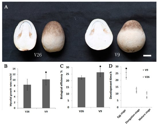 Differentiating characteristics of V. volvacea strains v26 and v9. (A) The “egg” stage in the development of V. volvacea. Note that the v26 fruiting body is oval-shaped, whereas v9 is bell-shaped. (B) Mycelial growth rates of V. volvacea strains v26 and v9. (C) The biological efficiency of v26 and v9. Both strains were cultivated on rice straw and cotton waste. (D) Developmental periods of v26 and v9. Strain v9 developed faster than v26. Each experiment was repeated three times. Mycelial growth rates, biological efficiency and developmental stages time were carried out by a Student’s t test. The mycelial growth rates, biological efficiency and egg stage time were significantly different (p < 0.05, The elongation stage and mature stage developmental time were not significantly different (p > 0.05). Bar = 1 cm in (A). Data are presented as the average ± SD in (B–D).