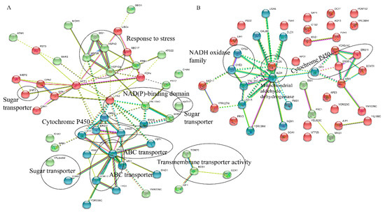 A total of 262 highly up-regulated DEGs and 302 highly down-regulated DEGs were obtained using string analysis (FDR < 0.001). A total of 58 up-regulated unigenes was annotated to 48 and 55 down-regulated unigenes was annotated to 44 (Figure 4). As shown in Figure 4A, up-regulated genes could be grouped into heat-shock proteins (HSPs), sugar transporters, ABC transporters, cytochrome P450, NAD(P)-binding domain and others (Figure 4A). Four heat-shock proteins, including HSP26, HSP104, HSP42 and SIS1 (Type II HSP40 co-chaperone), were highly expressed in v9 (FPKM > 1400) while those in v26 were not (FPKM < 700). Fourteen putative transporters were expressed at a higher level in v9 than those in v26. These transporters seem to be involved in various nutrient transportation; for example, four sugar transporters were found: HXT17 (hexose transporter), SNF3 (low glucose sensor that regulates glucose transport), YFL040W (transporter member of the sugar porter family) and YHK8 (presumed antiporter of the major facilitator superfamily); four ABC transporters were found: ATM1 (exports mitochondrially synthesized precursors of iron-sulfur (Fe/S) clusters to the cytosol), PDR12 (weak-acid-inducible multidrug transporter), SNQ2 (multidrug transporter) and YBT1 (bile acid transport); as well as other transporters were found: BCS1 (AAA ATPase family), COX1 (subunit I of cytochrome c oxidase), RSB1 (transport sphingoid long chain base (LCB)), SMF2 (manganese transporter), TOM70 (transit peptide receptor) and TPO1 (polyamine transporter that recognizes spermine, putrescine, and spermidine). Moreover, six up-regulated and five down-regulated unigenes were significantly enriched in the pathway of the ABC transporters (Table 4). The expression of gene ABCB1 (K05658, ATP-binding cassette, subfamily B (MDR/TAP), member 1) was higher in v9 than in v26. ABCB1 encoded the ATP-binding ATPases, which played important roles in the exportation of xenobiotics. Therefore, one can assume that v9 may more actively export xenobiotic molecules than v26.