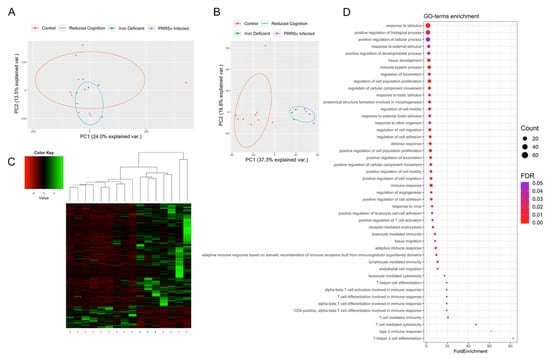 Altered gene expression between the reduced cognition (PRRSv infected and iron deficient pigs) and control groups was assessed, resulting in the identification of 420 DEGs, with 72 down- and 348 upregulated in the reduced cognition compared to control group. While samples did not cluster by group when comparing expression levels of the 38,219 tested genes (ANOSIM R = 0.1189, p-value = 0.075; Figure 1A), samples did cluster by group when comparing expression levels of the 420 DEGs (ANOSIM R = 0.6981, p-value = 0.001; Figure 1B,C). GO term enrichment analysis resulted in identification of 46 GO terms enriched for DEGs (Figure 1D). Enriched GO terms were associated with immune responses, angiogenesis, cellular development, migration, and proliferation.