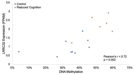 Differential methylation and expression of LRRC32. Hypermethylation of a 60 bp region in the 2nd intron of LRRC32 correlated with increased expression in the reduced cognition group (Pearson’s R = 0.72, p-value = 0.002).
