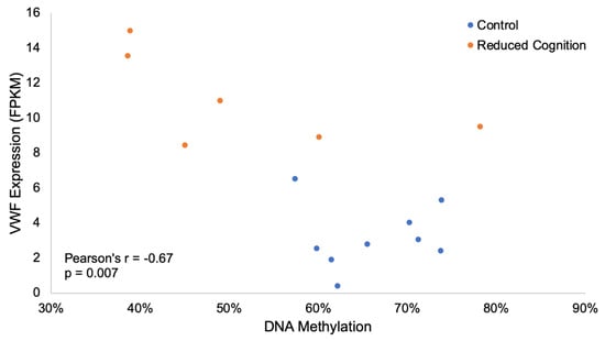 In addition to altered angiogenic regulation, DEGs involved in blood brain barrier (BBB) formation and permeability were also identified. AHNAK plays a role in BBB formation [], and was overexpressed in the reduced cognition group (log2 fold change 1.03). VWF and FLT1 expression are associated with BBB hyperpermeability [,], both of which displayed increased expression in the reduced cognition group (log2 fold change 1.82 and 1.01, respectively). In addition, hypomethylation of a 28 bp region (−14.54%) in the 11th intron of VWF correlated with increased expression in the reduced cognition group (Pearson’s R = −0.67, p-value = 0.007; Figure 5). This result is consistent with our previous study demonstrating hypomethylation of a CpG site within the same 28 bp region associated with increased VWF expression in the iron deficient group []. Together, the altered regulation and expression of VWF, in addition to increased FLT1 expression, suggests increased BBB permeability in the reduced cognition groups in response to early life environmental insults.