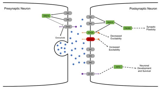 While genes in the cholinergic synapse pathway were not differentially expressed, five genes in this pathway were differentially methylated (Figure 6). GNG13 is a heterotrimeric G protein that functions as a signal transducer for 7-transmembrane-helix G protein-coupled receptors, including muscarinic acetylcholine receptors M2 and M4. GNG13 was hypermethylated in the reduced cognition group (11.53%). GNG13 activates PIK3R5, which was also hypermethylated in the reduced cognition group (10.23%). PIK3R5 is one of the subunits that forms a complex with PI3K, which is an essential regulator of synaptic plasticity []. In addition, GNG13 modulates the activity of G protein-coupled inwardly-rectifying potassium channels, including KCNJ6 and KCNJ4, which were hyper- (11.09%) and hypomethylated (−14.77%) in the reduced cognition group, respectively. Finally, hypermethylation of AKT2 was observed (10.02%). AKT2 is a key modulator of the AKT-mTOR signaling pathway, which controls integration of newborn neurons during adult neurogenesis, including correct neuron positioning, dendritic development, and synapse formation in response to nicotinic acetylcholine receptor signaling. Together, these results suggest altered cholinergic signaling underlies the reduced cognitive development observed in response to early life environmental insults.