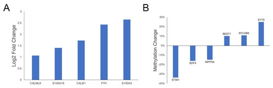 DEGs and genes overlapping DMRs related to calcium transport and binding. Log2 fold changes and percent methylation changes of (A) DEGs and (B) genes overlapping DMRs related to calcium transport and binding.