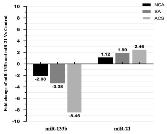 Relative fold changes of miR-133b and miR-21 in different categories of CAD compared to healthy controls. MiR-133b was downregulated by 8.45 fold in ACS, 3.38 fold in SA and 2.08 fold in NCA category patients as compared to healthy subjects. MiR-21 was upregulated by 2.46 fold in ACS, 1.90 fold in SA and 1.12 fold in NCA category patients as compared to healthy subjects.