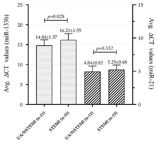 An altered expression pattern was observed in both the miRNAs in plasma samples of patients with subcategories of ACS group such as UA or NSTEMI (UA/NSTEMI) and STEMI, with STEMI being a more severe condition than NSTEMI. MiR-133b was able to significantly differentiate UA/NSTEMI (average ΔCT value of 14.84 ± 1.37) from STEMI (average ΔCT 16.21 ± 1.55) subjects, p = 0.028. Likewise, there was a clear expression difference in miR-21 between the two categories, average ΔCT 4.84 ± 0.82 vs. 5.25 ± 0.68 respectively; however, a significant difference was not observed (p = 0.332), as shown in Figure 4. These results indicate relatively lower expression of miR-133b and higher expression of miR-21 in STEMI as compared to NSTEMI/UA.