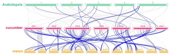 Collinear relationships of C2H2-ZFPs among cucumber, melon (Cucumis melo), and Arabidopsis. Gray lines in the background indicate collinear blocks within cucumber, melon, and Arabidopsis genomes while blue lines highlight the collinear C2H2-ZFP gene pairs.