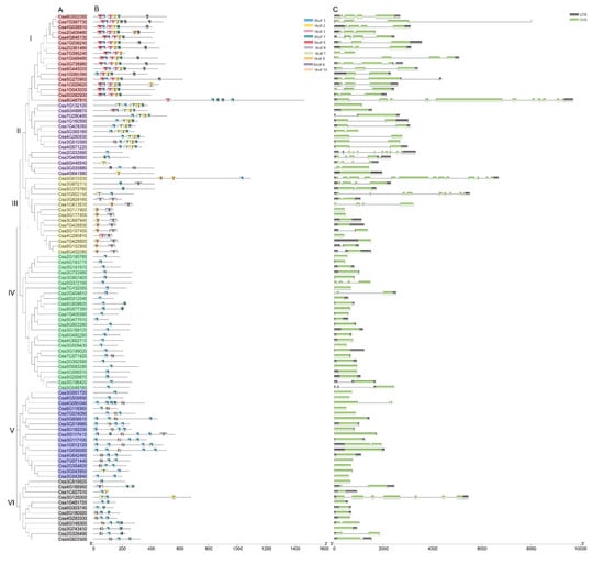 To better understand the phylogenetic relationships between the structure and function among cucumber C2H2-ZFP genes, the conserved motifs and exon/intron structure were analyzed (Figure 4). In the phylogenetic tree, all 101 C2H2-ZFP genes were divided into six groups, namely I, II, III, IV, V, and VI, containing 17, 14, 15, 26, 17, and 22 members, respectively. We identified ten conserved motifs among the 101 C2H2-ZFPs (Table S4). Domain 1 includes a plant-specific conserved sequence (‘QALGGH’), which was present in 85 proteins. In addition, the most closely related members had a common motif composition. For example, motifs 1, 2, 3, 4, and 5 were observed in most group I members. Motifs 6 and 8 were specifically detected in group III. The great majority of group IV members only contained motif 1.