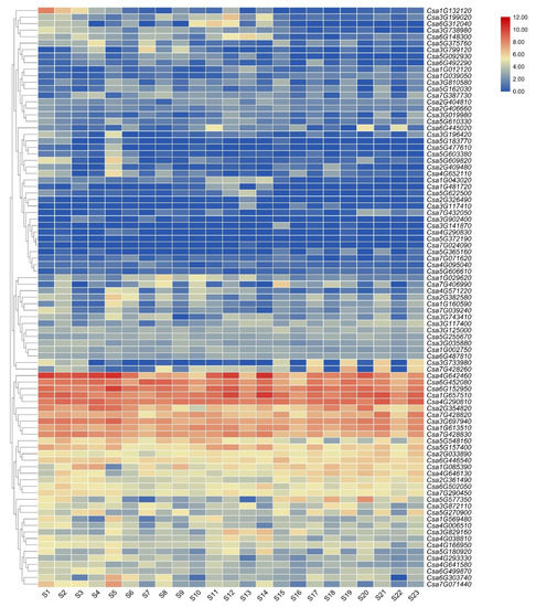 A heatmap showing the expression of C2H2-ZFP genes in different tissues. The following abbreviations are used: S1, roots of 4-week-old seedlings; S2, hypocotyl of 4-week-old seedlings; S3, cotyledon of 4-week-old seedlings; S4, true leaf of 4-week-old seedlings; S5, root; S6, stem; S7, young leaf (the second node from the top of cucumber plants); S8, petiole of young leaf; S9, old leaf (the fifth node from the top of cucumber plants); S10, petiole of old leaf; S11, tendril; S12, female flower; S13, male flower bud; S14, male flower; S15, unfertilized ovary; S16, peel of unfertilized ovary; S17, flesh of unfertilized ovary; S18, peel of 1-week-old fruit; S19, flesh of 1-week-old fruit; S20, peel of 2-week-old fruit; S21, flesh of 2-week-old fruit; S22, peel of 3-week-old fruit; S23, flesh of 3-week-old fruit. [45]. Genes highly expressed in tissues are colored red and genes not expressed in tissues are colored blue.