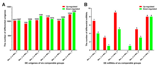 Statistics for DE unigenes and miRNAs in each comparable group. (A) Statistics of DE unigenes. (B) Statistics of DE miRNAs. q value < 0.005 and |log2(fold change)|>1 were used as thresholds of significance for DE unigenes. q value < 0.01 and |log2 (fold change)|>1 were used as thresholds of significance for DE miRNAs.
