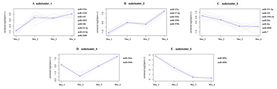K-means clustering of ED miRNAs. (A,B,D): The expression levels of miRNAs increased gradually after adolescence. (C,E): The expression levels of miRNAs decreased gradually after adolescence.