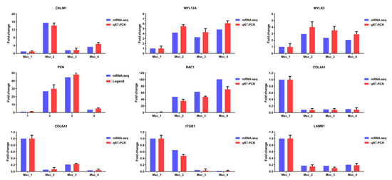 qRT-PCR validation of mRNA-seq data. The expression levels of nine differentially expressed genes (CALM1, COL4A1, COL6A1, ITGB1, LAMB1, RAC1, MYL12A, MYLK2, and PXN) were normalized against GAPDH. The vertical axis indicates the normalized genes expression level for each stage. For each gene, the expression level and sequencing abundance in Msc_1 were given as a negative control and set at 1.