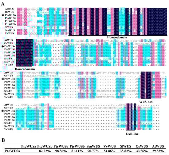 PtoWUSa was highly conserved in a broad range of plant species. (A) Amino acid sequence alignment of PtoWUSa with AtWUS (Arabidopsis thaliana), OsWUS (Oryza sativa), PtrWUS (Populus trichocarpa), SlWUS (Solanum lycopersicum), SsuWUS (Salix suchowensis), and VvWUS (Vitis vinifera) orthologous genes in other plant species. The conserved regions (homeodomain, WUS-box motif, and ethylene-responsive element binding factor associated amphiphilic repression (EAR)-like domain) were underlined. (B) WUS amino acid sequence identity.
