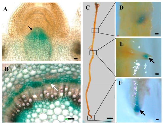 The GUS reporter of PtoWUSa was conducted to confirm the expression pattern of PtoWUSa. GUS staining, showing that the GUS signals were detected in the SAM (Figure 2A) and stem (Figure 2B) and roots (Figure 2C–F). The roots from the poplar stem were named ARs, and the roots located in the ARs were named LRs. In roots, the GUS signal was specially detected in the AR tip (ART) and the LR tip (LRT) (Figure 2C–F). These results indicated that the PtoWUSa accumulated in LRT and ART in the roots, suggesting that PtoWUSa might play roles in root development.