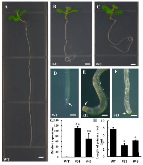 Reduced root length and changed morphology by overexpression of PtoWUSa in Arabidopsis. (A–C) two-week-old of WT (A) and PtoWUSa-overexpressing Arabidopsis plants including two independent transgenic lines of #31 (B) and #43 (C). (D–F) The primary root of WT (D) and two transgenic lines (E,F). Arrows pointed to primary root tip. (G) Transcription levels of PtoWUSa in transgenic plants. AtACTIN was used as a reference gene. The expression level in WT was set to 1. (H) The length of root of WT and transgenic plants. * and ** indicated the difference between WT and each transgenic line at p < 0.05 and p < 0.01 levels, respectively. Scale bars: (A–C) = 0.2 cm; (D–F) = 200 μm.