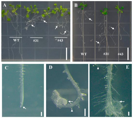 As the herb model plant, Arabidopsis has a rapid lifecycle and easy transformation system. Therefore, we firstly investigated the function of PtoWUSa by ectopic expression of PtoWUSa in Arabidopsis. Two independent transgenic lines (#31 and #43) with high abundance of PtoWUSa (Figure 3G) were chosen for functional study. After cultured on 1/2 MS medium for two weeks, the length of primary roots of PtoWUSa-overexpressing Arabidopsis seedlings was severely inhibited and was only 50% of WT seedlings (Figure 3A–C,H). Interestingly, the roots of transgenic plants appeared to curve and showed agravitropism (Figure 3A–C), and their root tip was enlarged and swollen (Figure 3D–F). After three weeks of growth, the abnormal root morphology of transgenic plants was intensified, such as the decreased primary root length, agravitropism, and curved root (Figure 4). The root hair and LRs were located closer to the root tip in transgenic plants, being different with WT plants (Figure 4F,H). It is noteworthy that the LR length of transgenic plants was increased compared with WT plants when the transgenic LRs were stretched out (Figure 4B).