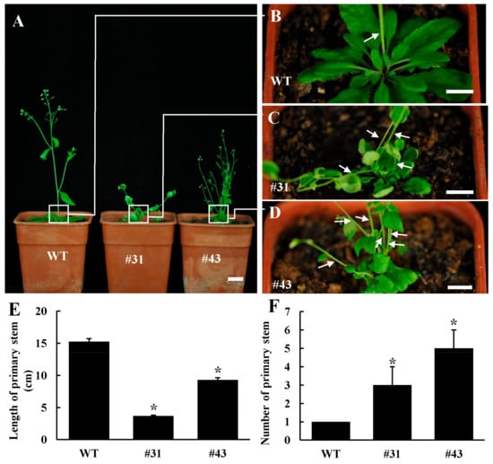 Moreover, the PtoWUSa-overexpressing Arabidopsis plants exhibited more branches than WT plants (Figure 5A–D), and the stem number of transgenic plants reached to four to six (Figure 5F), but the height of primary stem of transgenic plants was reduced to 1/3–1/2 of WT plants after growing on soil for four weeks (Figure 5E).