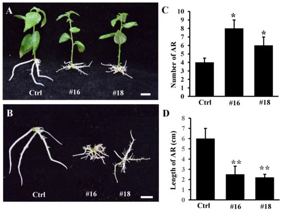 Overexpression of PtoWUSa promoted AR formation and inhibited its elongation in poplar. (A,B) Comparison of three-week-old Ctrl and PtoWUSa-overexpressing poplar plants including two independent transgenic lines #16 and #18. (C,D) Comparison of AR number (C) and AR length (D) between Ctrl and transgenic plants. * and ** indicated the difference between Ctrl and each transgenic line at p < 0.05 and p < 0.01 levels, respectively. Scale bar: 1 cm.