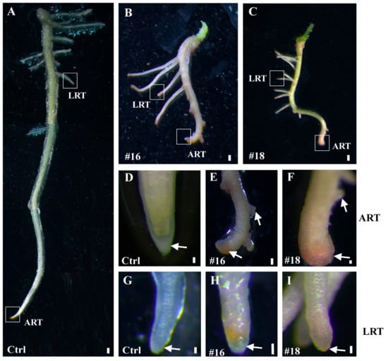 Root morphology of Ctrl and PtoWUSa-overexpressing poplar plants. (A–C) ARs of Ctrl and transgenic plants. (D,F) Close-up views of ARTs of Ctrl and transgenic plants from (A–C). (G–I) Close-up views of LRTs of Ctrl and transgenic plants from (A–C). Scale bars: (A–C) = 1 mm; (D,F–I) = 1 μm; (E) = 3 μm.