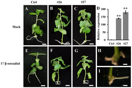 Growth phenotype of Ctrl and pXVE::PtoWUSa transgenic plants (including two independent transgenic lines #26 and #27) treated with 0 μM (A–C) and 10 μM (E–G) 17 β-estradiol for three weeks. (D) Expression levels of PtoWUSa in Ctrl and transgenic plants after treated 10 μM 17 β-estradiol. (H,I) Close-up views of ARs of transgenic line #26 from (F) and #27 from (G). PtoACTIN was used as reference gene. The expression level in Ctrl was set to 1. ** indicated the difference between Ctrl and each transgenic line at p < 0.01 level. Scale bar: (A–C,E–G) = 1 cm; (H,I) = 3 cm.