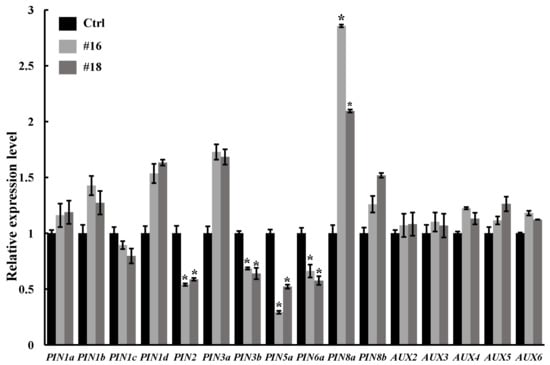 The extensive researches have been shown that auxin acts as an important regulator in root development. The root morphology of transgenic plants overexpressing PtoWUSa was similar to the pin or aux mutants. This observation impelled us to clarify whether this phenotype in the present study was caused through altered distribution of auxin in transgenic plants. Thus, we examined the expression of auxin transport genes including AUX and PIN in the ARs of three-week-old PtoWUSa-overexpressing plants and Ctrl plants. The expression levels of eleven PINs and five AUXs were successfully detected. Among PIN genes, the expression levels of five PIN genes (PIN1c, PIN2, PIN3b, PIN5a, and PIN6a) for auxin polar transport were reduced, while other genes were slightly up-regulated (Figure 9). The expression levels of AUXs were no obvious change (Figure 9). These results suggested that overexpression of PtoWUSa might affect polar transport in the ARs by regulating the expression of PINs.