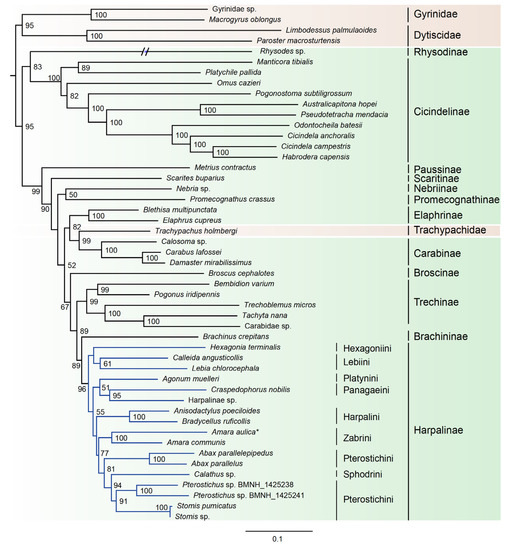 Maximum likelihood tree inferred from the dataset of 49taxa_PCGRNA using IQ-TREE, under the partition schemes and best-fitting models selected by PartitionFinder. Bootstrap support values (≥50) are indicated near the nodes. The branch of Rhysodes is depicted as half of its original branch length. Green background indicates the ingroup taxa of Carabidae, and brown indicates the outgroups. Blue lines indicate the Harpalinae. The newly determined Amara aulica is emphasized by asterisk.