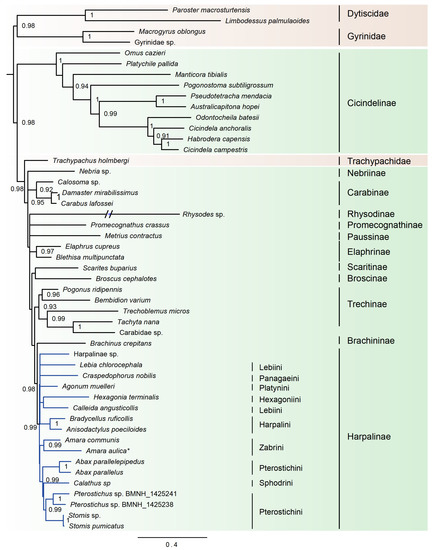 Recent studies on the suborders of Coleoptera or on the whole Coleoptera phylogeny also involved the exemplars of Carabidae. Hunt et al. (2007) [33] suggested that the monophyletic Geadephaga (comprising Trachypachidae, Rhysodidae and Carabidae including cicindelines) [34] formed a sister group to (Hydradephaga + Derodontoidea). At the subfamily level, the Harpalinae was strongly supported as a sister group to Paussinae, while the Cicindelinae was placed in a derived position and sister to a clade of (Rhysodinae + Migadopinae) [33]. Bocak et al. (2014) recovered the monophyletic Cicindelinae as a sister group to Haliplidae [35]. Timmermans et al. (2016) supported Carabidae as non-monophyletic and that tiger beetles were recognized as a separate family (namely Cicindelidae) [36]. Crampton-Platt et al. (2015) clustered the families Carabidae, Tenebrionidae, Coccinellidae and Ptilodactylidae in a clade to form the superfamily Caraboidea, which is sister to Archostemata [37]. In the study of Mckenna et al. (2015), the monophyletic Geadephaga was retrieved as sister to Hydradephaga, whereas the Carabidae was shown to be non-monophyletic with respect to Trachypachidae and Rhysodidae [38]. Baca et al. (2017) inferred Hydradephaga as a paraphyletic group, with Gyrinidae sister to Geadephaga (containing families Carabidae and Trachypachidae) [39]. López-López and Volger (2017) supported Geadephaga and Hydradephaga as two independent lineages based on the mitogenomic data, and recovered cicindelids and trachypachids as sister to all other Geadephaga [40]. Moreover, the authors suggested that the groups of cicindelids and trachypachids deserved the family status, namely, the Cicindelidae and Trachypachidae. Zhang et al. (2018) supported the monophyly of Carabidae and the most-basal position of Cicindela (Cicindelinae) within Carabidae [41]. In summary, resolving the phylogenetic relationships among these taxonomic groups is important and deserves further investigation.