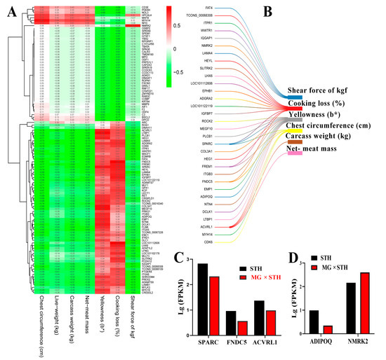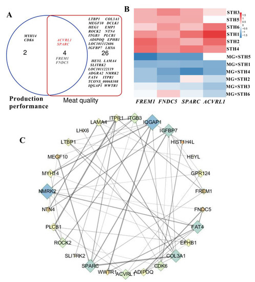 3.5. Gene Coexpression Analyses of Targeted DEGs Related to Production Performance and Meat Quality in MG × STH and STH Sheep