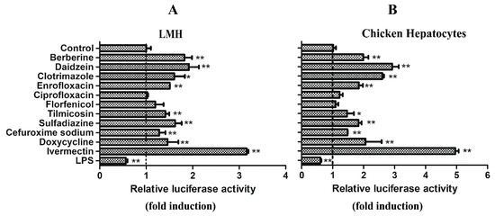 A luciferase reporter assay was performed to screen the regulators for the chicken Abcg2 promoter from the commonly used drugs licensed in veterinary medicine, including clotrimazole, enrofloxacin, ciprofloxacin, florfenicol, tilmicosin, sulfadiazine, cefuroxime sodium, doxycycline, and ivermectin, as well as the natural compounds berberine and daidzein. LPS was also testes. As shown in Figure 4, among the selected drugs and natural compounds, ivermectin was the most effective activator of the chicken Abcg2 gene promotor, causing 3.2- and 4.9-fold inductions in the LMH cells (Figure 4A) and chicken primary hepatocytes (Figure 4B), respectively. For the other drugs, although the Abcg2 promoter was also activated, the luciferase activities were only changed by 1.4–1.6-fold in the LMH cells (Figure 4A) and 1.5–2.6-fold in the chicken primary hepatocytes (Figure 4B). In this study, we failed to observe activation of the Abcg2 promoter by florfenicol and ciprofloxacin. However, LPS significantly decreased (p < 0.01) the luciferase activity levels of the Abcg2 promoter, with the reporter gene constructs being 0.56- and 0.6- fold in the LMH cells and chicken hepatocytes, respectively (Figure 4).