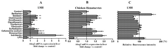 The LMH cells and chicken hepatocytes were seeded in 12-well plates and incubated overnight until grown to 70%–80% confluence. The cells were then treated with individual xenobiotics for 6 h. The final concentration of each xenobiotic was 30 µM, except ivermectin (10 µM) and LPS (50 µg/mL). After treatment, the total RNA was isolated using TRIzol Reagent (Invitrogen, Carlsbad, CA, No. 10296010) according to the manufacturer’s instructions and treated with DNase to remove any DNA contamination. RNA was quantified using a photometer (Eppendorf, Hamburg, Germany) at 260/280 nm. The RNA integrity was confirmed via 1% agarose gel electrophoresis and ethidium bromide staining. Accordingly, cDNA was synthesized using a reverse transcription kit (Takara, Toyobo, Japan, No. RR047) according to the manufacturer’s protocol. Chicken Abcg2 was quantified using SYBR Green Realtime PCR Master Mix (Takara, Toyobo, Japan, No. RR420) with a real-time PCR detection system (Bio-Rad Laboratories, Hercules, CA). Chicken β-actin was chosen to be the internal control. The relative levels of Abcg2 were analyzed using the 2−ΔΔCt method [35].