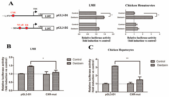 Figure 6A shows that the transfection of the pGL3-D1 construct containing putative CXR binding site resulted in a significant induction of luciferase activity compared with the pGL3-Basic vector in both cell types (p < 0.01). However, the induced function of daidzein disappeared when the pGL3-D2 construct was transfected. Therefore, we assumed that the daidzein may regulate the chicken Abcg2 gene promoter via the putative CXR binding site. To confirm this hypothesis, we introduced mutations into the CXR binding site, then transfected it into LMH cells and chicken hepatocytes and determined the luciferase activity levels. As shown in Figure 6B, if the CXR binding site was mutated, the luciferase activity significantly decreased from 1.49-fold to 1.12-fold in the LMH cells and 3.15-fold to 1.34-fold in the chicken hepatocytes. These results demonstrated that the putative CXR binding site was involved in the response of the Abcg2 gene promoter induced by daidzein.