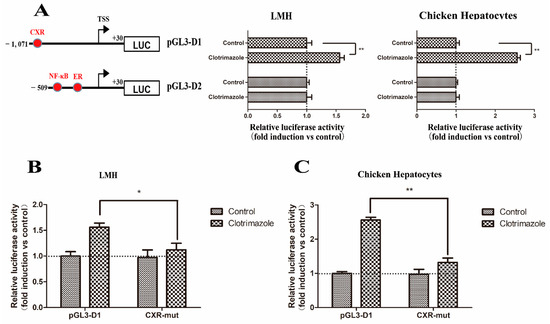 Similar to daidzein, clotrimazole activated the chicken Abcg2 gene promoter only when the pGL3-D1 construct (p < 0.01) was transfected compared with pGL3-D2 construct (p > 0.05) in both the LMH cells and chicken hepatocytes (Figure 7A). The CXR binding site mutation significantly decreased the luciferase activity from 1.74-fold to 1.12-fold in the LMH cells (Figure 7B) and 2.57-fold to 1.23-fold in the chicken primary hepatocytes (Figure 7C), indicating that clotrimazole activated the Abcg2 gene promoter via the putative CXR binding site.