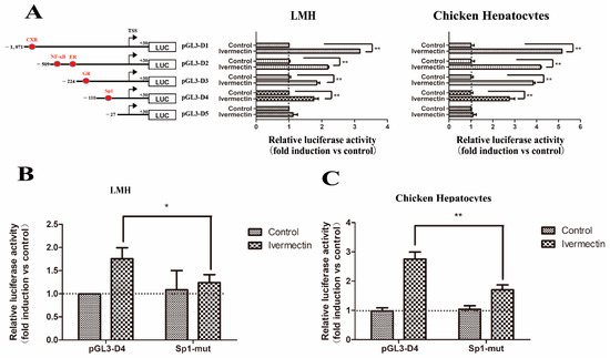 Regulation of chicken Abcg2 promoter activity by ivermectin. (A) Isolation of the promoter elements responsible for mediating the stimulation of the Abcg2 gene promoter activity by ivermectin. LMH cells and chicken hepatocytes were transfected with deletion constructs of the Abcg2 promoter. A schematic illustration of the Abcg2 gene promoter reporter plasmids used is shown in the left panel. A point mutation was introduced into the pGL3-D4 construct. (B) LMH cells and (C) chicken hepatocytes were transfected with each mutant. The fold increase in the luciferase activity by ivermectin treatment of each construct is indicated. * represents p < 0.05 and ** represents p < 0.01.