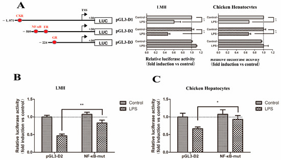 LPS showed a significantly (p < 0.01) inhibitory effect on the Abcg2 gene promoter when the pGL3-D1 and pGL3-D2 constructs were transfected into both cell types (Figure 9A). However, the mutation of the NF-κB binding site significantly increased the luciferase activity from 0.45-fold to 0.89-fold in LMH cells (Figure 9B) and 0.61-fold to 0.94-fold in chicken hepatocytes (Figure 9C), indicating that putative NF-κB, rather than the ER or the CXR binding site, was involved in the response of the Abcg2 gene promoter induced by LPS.