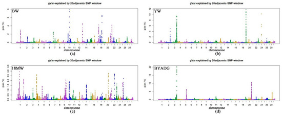 Manhattan plots for the percentage of genetic variance by 20 adjacent SNP windows for growth traits in Chinese Simmental beef cattle. gVar (%) represent the proportion of genetic variance explained by 20 adjacent SNPs. (a) BW: birth weight; (b) YW: yearling weight; (c) 18MW: body weight at the age of 18 months; (d) BYADG: average daily gain from birth to yearling.